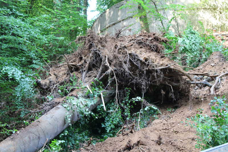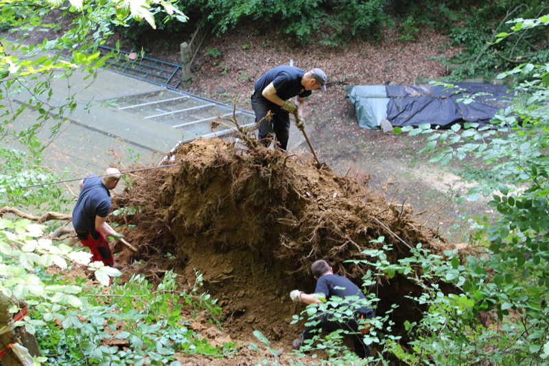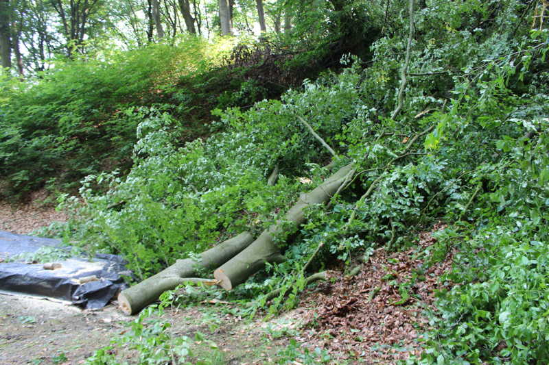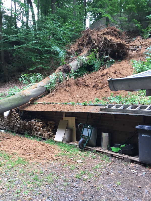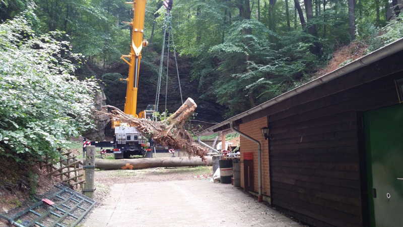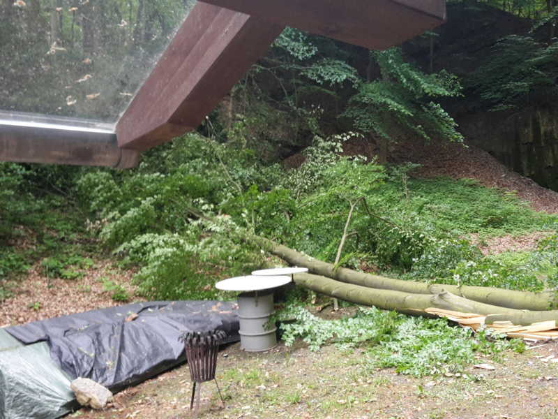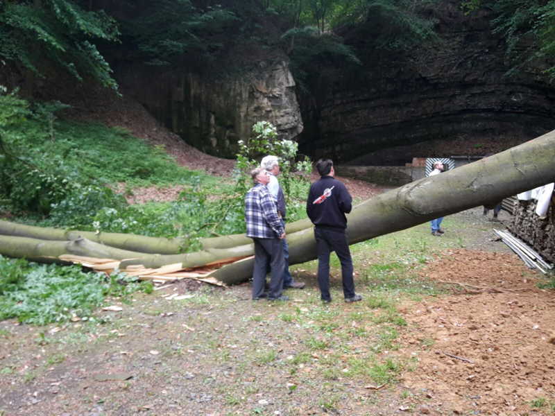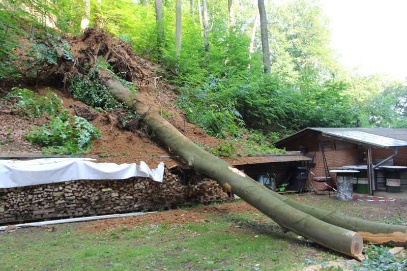 Am 27.05.2016 hatten wir großes Glück, dass niemand verletzt wurde. Kurz vor unserer Versammlung fiel oberhalb des Schießkanals eine große Buche quer über den Platz.