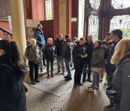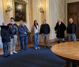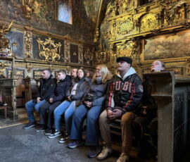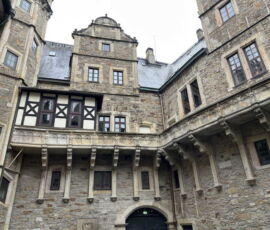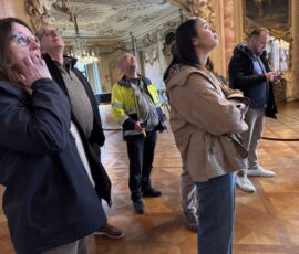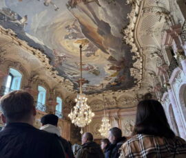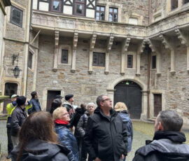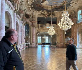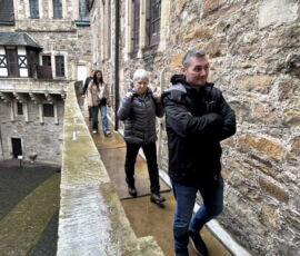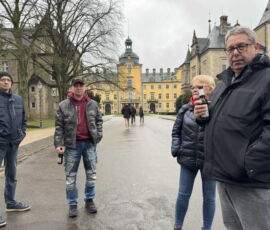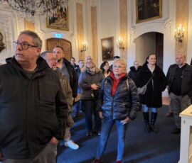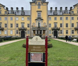 Das Schloss Bückeburg war am 14.03.2026 das Ziel des Familienausflugs der 1. Kompanie. Bei regnerischem Wetter startete kurz gegen Mittag eine etwas erweiterte Führung durch das Schloss. Die Gesichter waren in den meisten Räumen nach oben gerichtet, da die herrlich bemalten Decken oder die Stuckarbeiten bewundert wurden. Erweitert war die Führung, da die Gruppe auch im Dachgeschoss die ehemaligen Räume des Personals besichtigen durfte. Im Gobelin-Saal konnte man einen Schlüssel in einem Rahmen sehen. Dies ist der Originalschlüssel für das Schloss der Kapelle, der vor einigen Jahren von einem Besucher einmal gestohlen und dann reumütig doch wieder zurückgeschickt wurde. Daneben stehen in diesem Saal zwei chinesische Hocker, die als Sitzheizung dienten, indem innen auf einer Schicht Sand glühende Holzkohle im Winter für Wärme zumindest von unten sorgen konnte. Die Erklärung, dass hiervon die Redewendung „Auf heißen Kohlen sitzen“ kommt, ist zwar nicht abwegig, dürfte aber erst in späterer Zeit übernommen worden sein. Wahrscheinlicher ist, dass der sogenannte Hexenstuhl im Mittelalter eine übliche Foltermethode war. Dabei wurde unter dem Sitzmöbel ein Feuer mit Kohlen entzündet, was für den Delinquenten eine extrem schmerzhafte Situation darstellte, die zu panischer Unruhe führte.