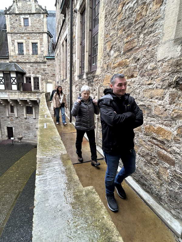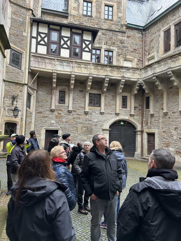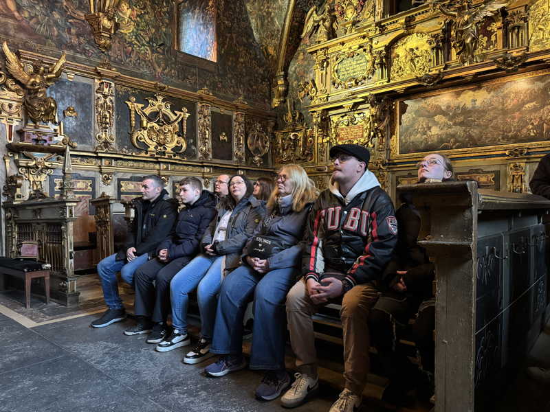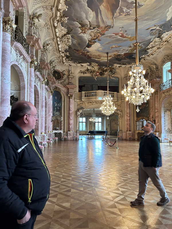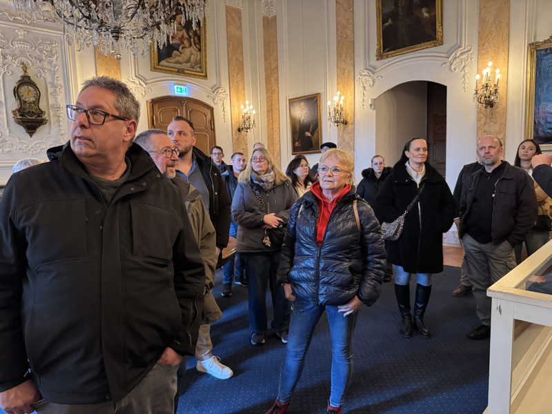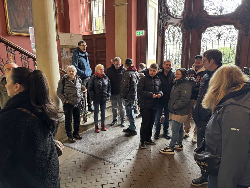 Das Schloss Bückeburg war am 14.03.2026 das Ziel des Familienausflugs der 1. Kompanie. Bei regnerischem Wetter startete kurz gegen Mittag eine etwas erweiterte Führung durch das Schloss. Die Gesichter waren in den meisten Räumen nach oben gerichtet, da die herrlich bemalten Decken oder die Stuckarbeiten bewundert wurden. Erweitert war die Führung, da die Gruppe auch im Dachgeschoss die ehemaligen Räume des Personals besichtigen durfte. Im Gobelin-Saal konnte man einen Schlüssel in einem Rahmen sehen. Dies ist der Originalschlüssel für das Schloss der Kapelle, der vor einigen Jahren von einem Besucher einmal gestohlen und dann reumütig doch wieder zurückgeschickt wurde. Daneben stehen in diesem Saal zwei chinesische Hocker, die als Sitzheizung dienten, indem innen auf einer Schicht Sand glühende Holzkohle im Winter für Wärme zumindest von unten sorgen konnte. Die Erklärung, dass hiervon die Redewendung „Auf heißen Kohlen sitzen“ kommt, ist zwar nicht abwegig, dürfte aber erst in späterer Zeit übernommen worden sein. Wahrscheinlicher ist, dass der sogenannte Hexenstuhl im Mittelalter eine übliche Foltermethode war. Dabei wurde unter dem Sitzmöbel ein Feuer mit Kohlen entzündet, was für den Delinquenten eine extrem schmerzhafte Situation darstellte, die zu panischer Unruhe führte.